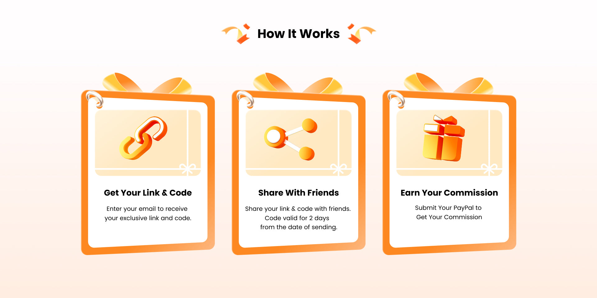 Earn 10% commission on your friend’s order amount, based on the actual payment (excluding taxes, shipping, and discounts).